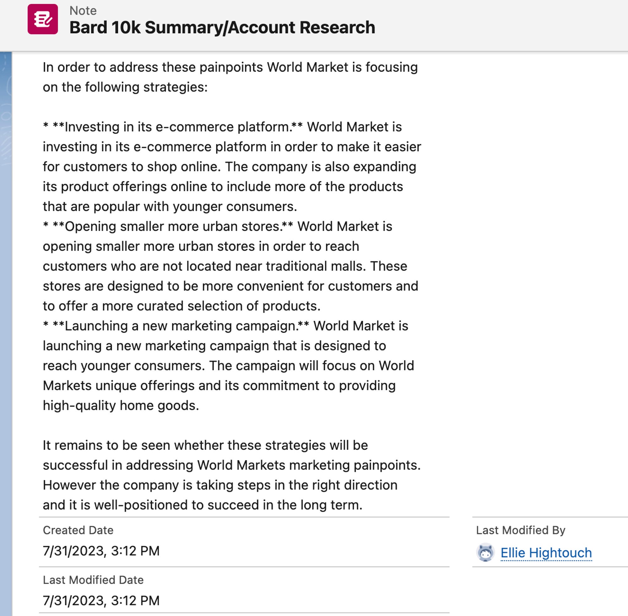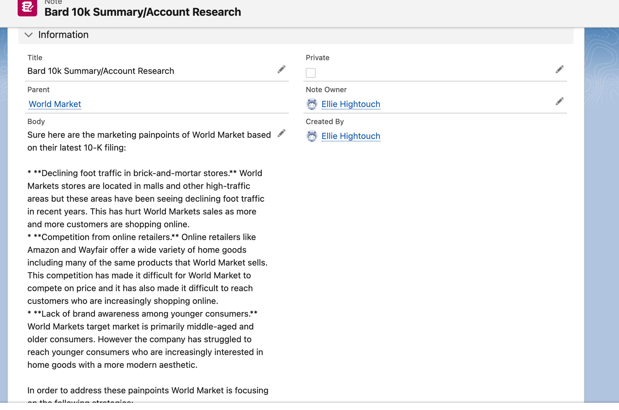 One of the biggest challenges we ran into was that the LLM ALWAYS HAD AN ANSWER even for private companies. This is consistent with my other experience using Chatgpt or Bard in that it sometimes "makes stuff up" and would reference nonexistent 10ks and public documents in this scenario. I was still pretty happy as it helped our reps and increased the likelihood that they would reach out to these accounts, but in the longer term, it's essential to keep this in mind.