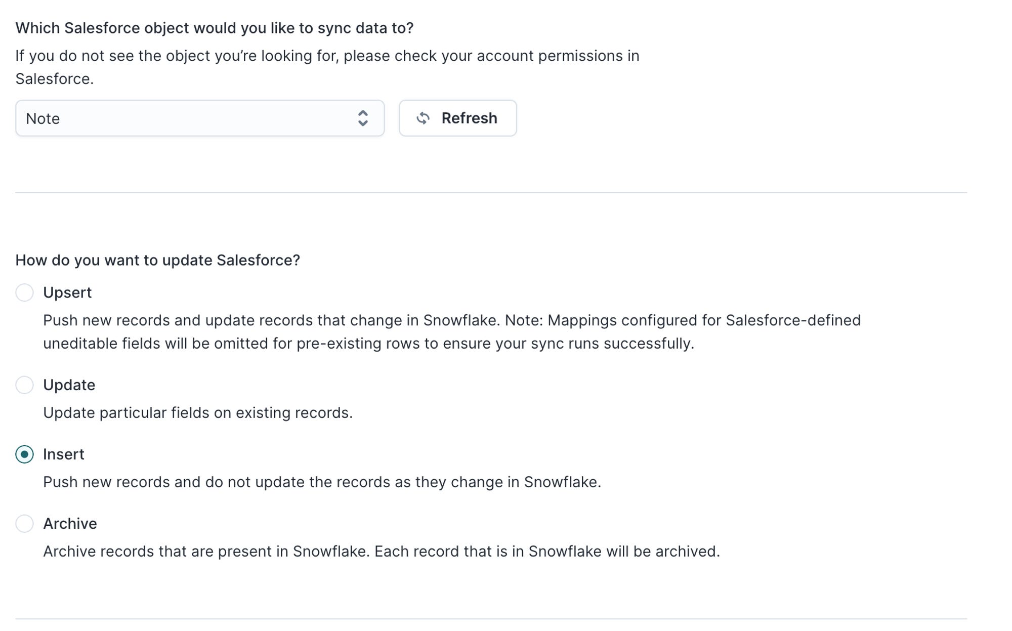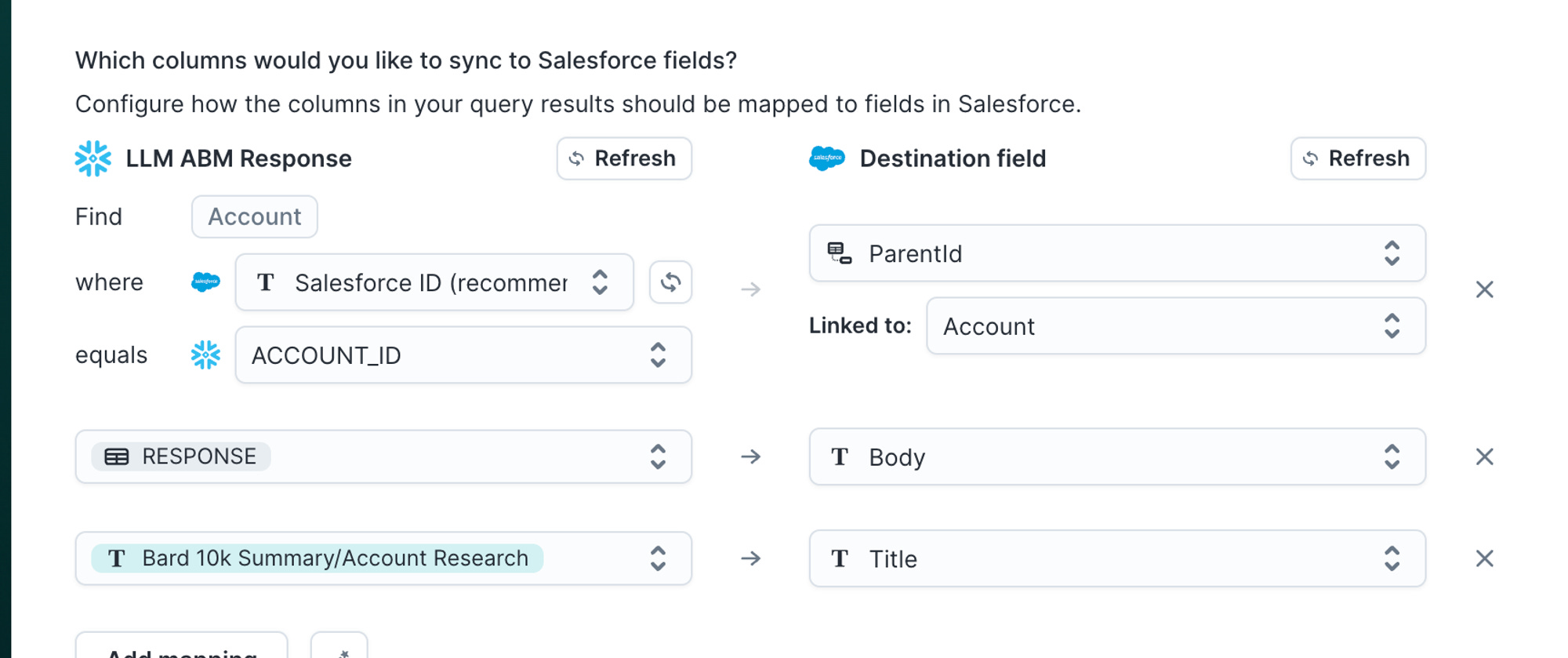 Now that we have a table with Account ID and AI response, we can then send that anywhere downstream with Hightouch, but we elected to use the salesforce note object as that would be most accessible for the reps. I just created a model in Hightouch and select * from our table with the responses. Hightouch will detect any time there is a new row and will insert it into Salesforce.